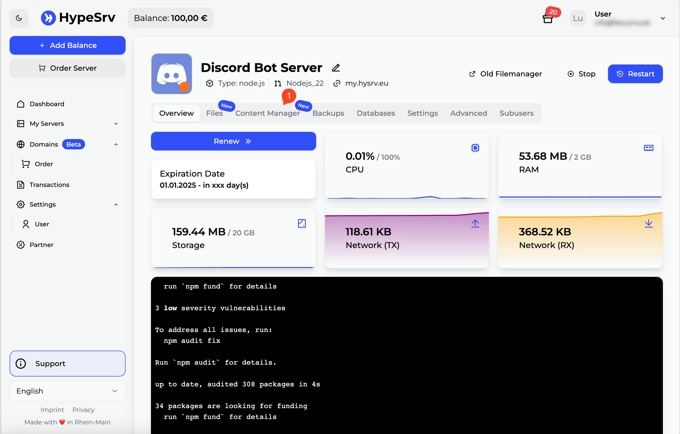When it has finished, simply start the server to install the bot dependencies and generate the .env file.