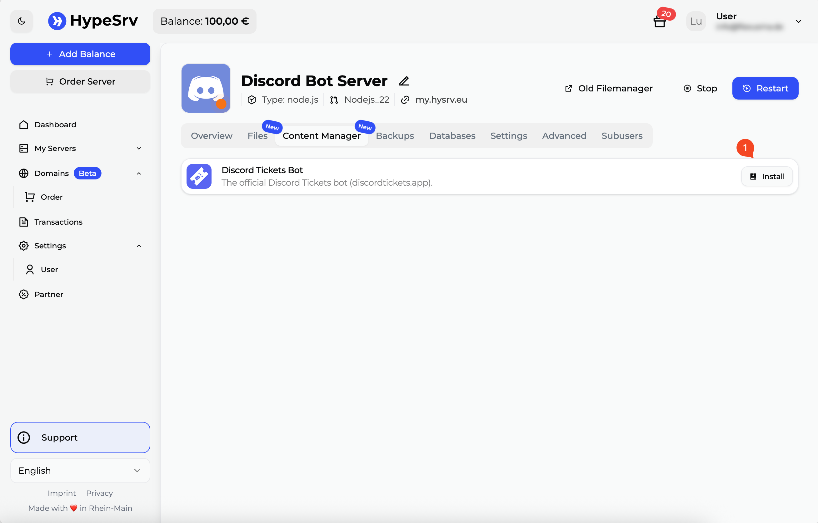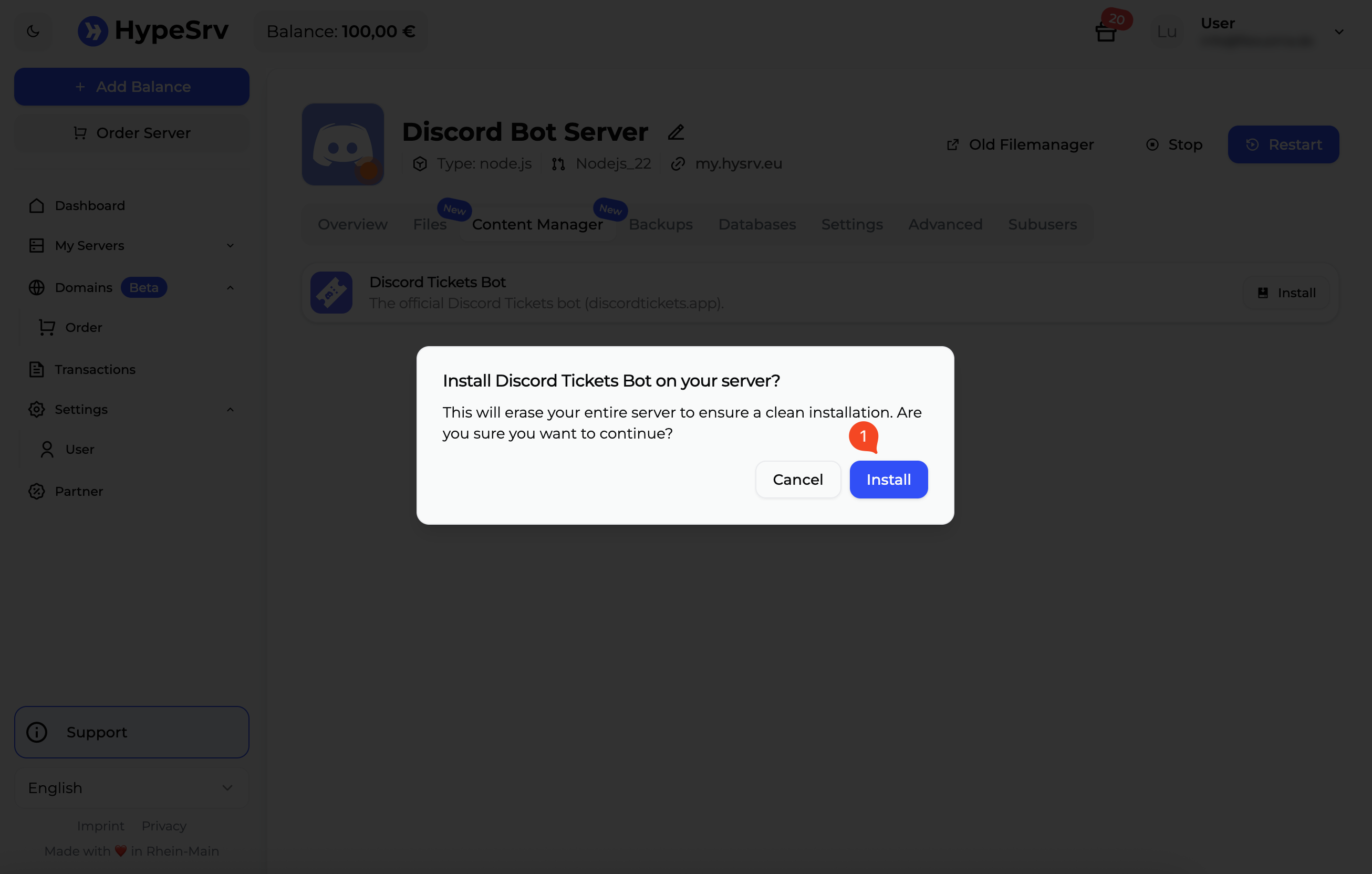 After purchasing your Discord Bot Server, click on Content Manager in your Server Dashboard, then select Discord Tickets Bot and hit install.