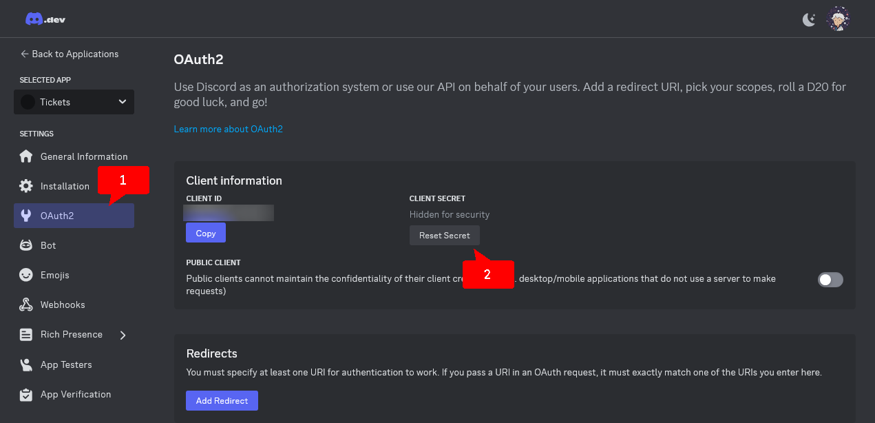 OAuth2page and clickReset Secret, thenYes, do it!. Copy the new secret and set it as yourDISCORD_SECRETenvironment variable.